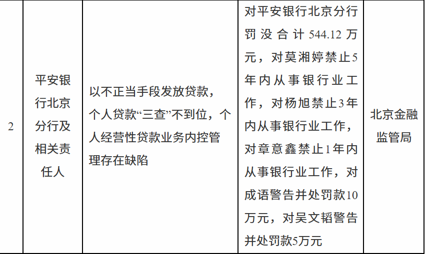 10月17日,国家金融监督管理总局北京监管局行政处罚信息公开表显示,平安银行北京分行及相关责任人因以不正当手段发放贷款,个人贷款“三查”不到位,个人经营性贷款业务内控管理存在缺陷被罚没合计544.12万元,对莫湘婷禁止5年内从事银行业工作,对杨旭禁止3年内从事银行业工作,对章意鑫禁止1年内从事银行业工作,对成语警告并处罚款10万元,对吴文韬警告并处罚款5万元